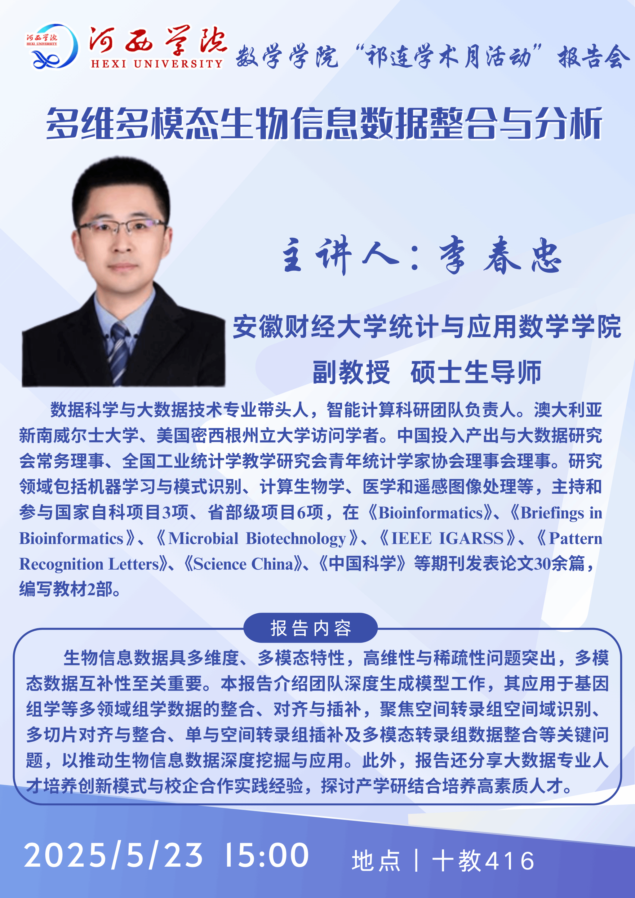 【学术报告】安徽财经大学教授 李春忠 |多维多模态生物信息数据整合与分析